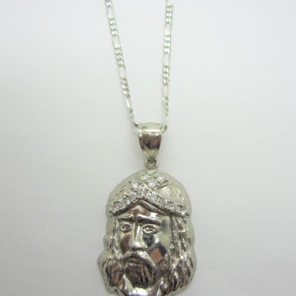 10K white gold Jesus pendant. This pendant is beautifully detailed with 11 cubic stones that adorn His head. The stones are approximately 2.4mm in size and each are held by four claws. This pendant looks beautiful on a chain as pictured and would definitely be a statement piece!